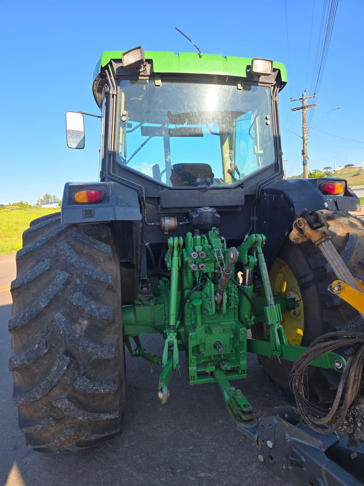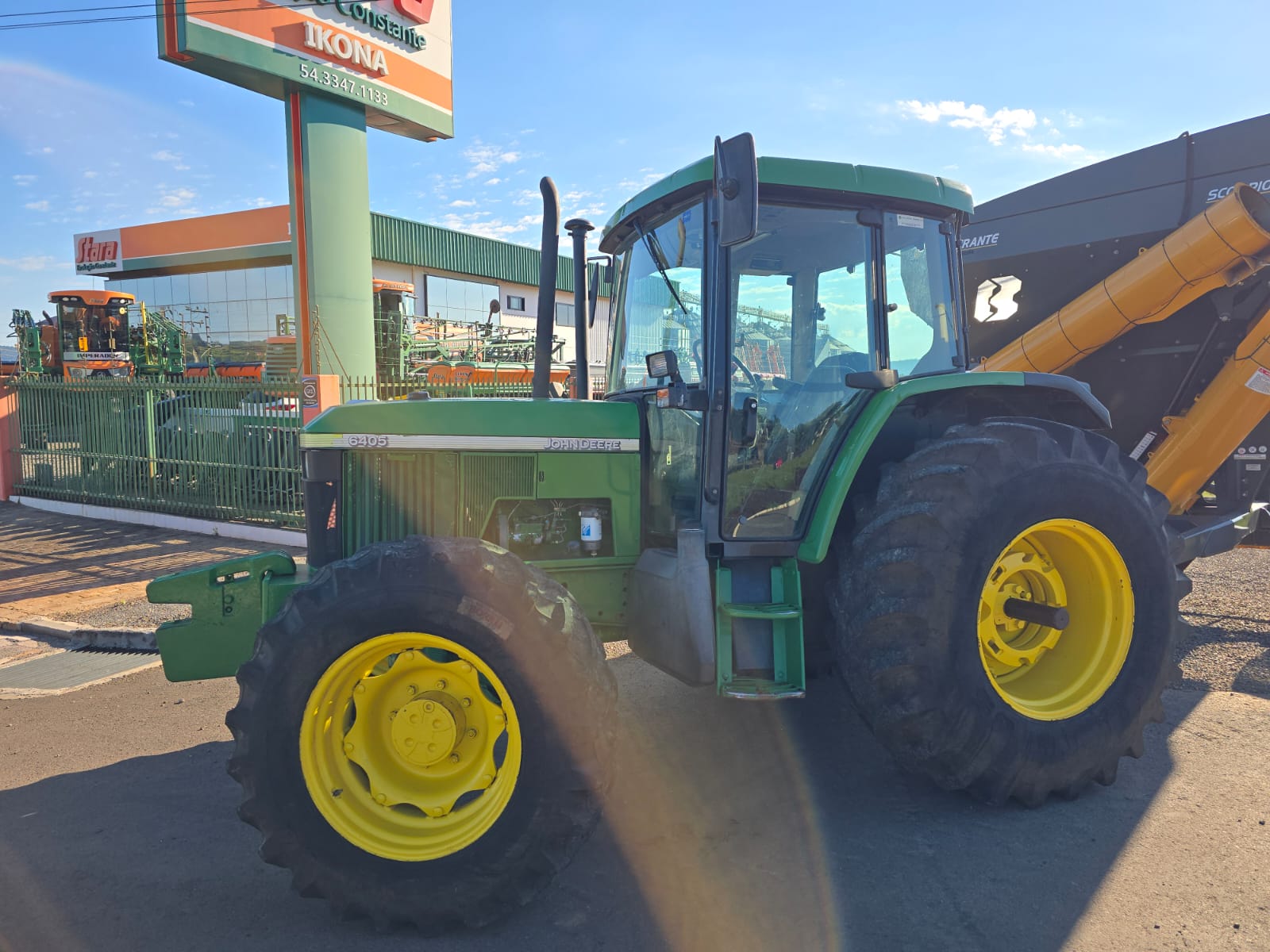 TRATOR AGRÍCOLA MODELO JD 6405, COM CABINE, CJ. ENGATE 3 PONTOS, COMANDO HIDRÁULICO DUPLO, CJ RODADO TRASEIRO 23.1-30 E DIANTEIRO 14.9-26, ANO 2004, MARCA JHON DEERE.